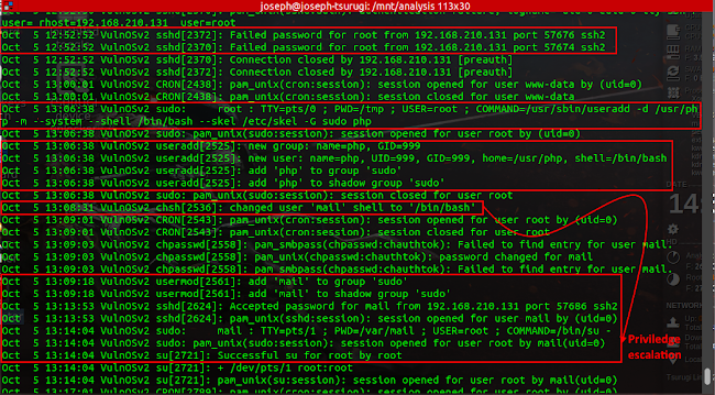 being added to the sudo group. The mail user was logged in through ssh. We can also see that the mail user was able to gain elevated privileges and was able to open a session as root.